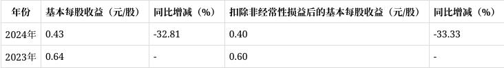 基本每股收益为0.43元/股,较2023年的0.64元/股下降32.81%;扣除非经常性损益后的基本每股收益为0.40元/股,同比下降33.33%。这主要是由于净利润的下滑以及股本的增加(2024年实施限制性股票激励计划,总股本从169,932,000股增加至171,132,000股)所致。