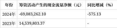 筹资活动产生的现金流量净额为-69,083,262.10元,2023年为14,539,803.37元,同比下降575.13%。主要原因是本期现金分红金额较去年同期增加,显示公司在盈利情况下,积极回报股东,但也可能对公司的资金流动性产生一定影响。