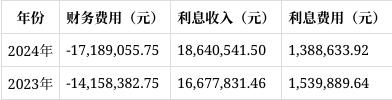 财务费用为-17,189,055.75元,去年同期为-14,158,382.75元。财务费用的变化主要受利息收入和支出的影响,2024年利息收入为18,640,541.50元,利息费用为1,388,633.92元,利息收入的增加使得财务费用进一步为负。