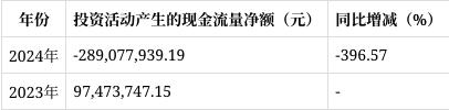 投资活动产生的现金流量净额为-289,077,939.19元,而2023年为97,473,747.15元,同比下降396.57%。主要原因是本期赎回银行理财同比减少,这可能反映出公司在投资策略上的调整,减少了短期理财投资,或许是为了储备资金用于其他战略布局或应对市场不确定性。