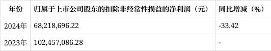 归属于上市公司股东的扣除非经常性损益的净利润为68,218,696.22元,较2023年的102,457,086.28元减少33.42%。这表明公司主营业务盈利能力面临压力,市场环境变化对公司核心业务的冲击较为明显。