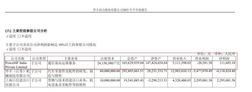 华丰股份印度子公司2025年上半年财务情况图片来源:华丰股份2025年半年报截图
