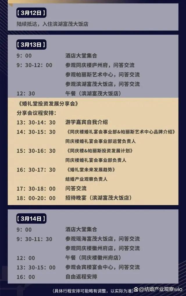 同庆楼集团游学开启,3月14-15日参观旗下6家门店,在婚礼堂投资发展分享会中,还有专题分享和未来趋势解读。