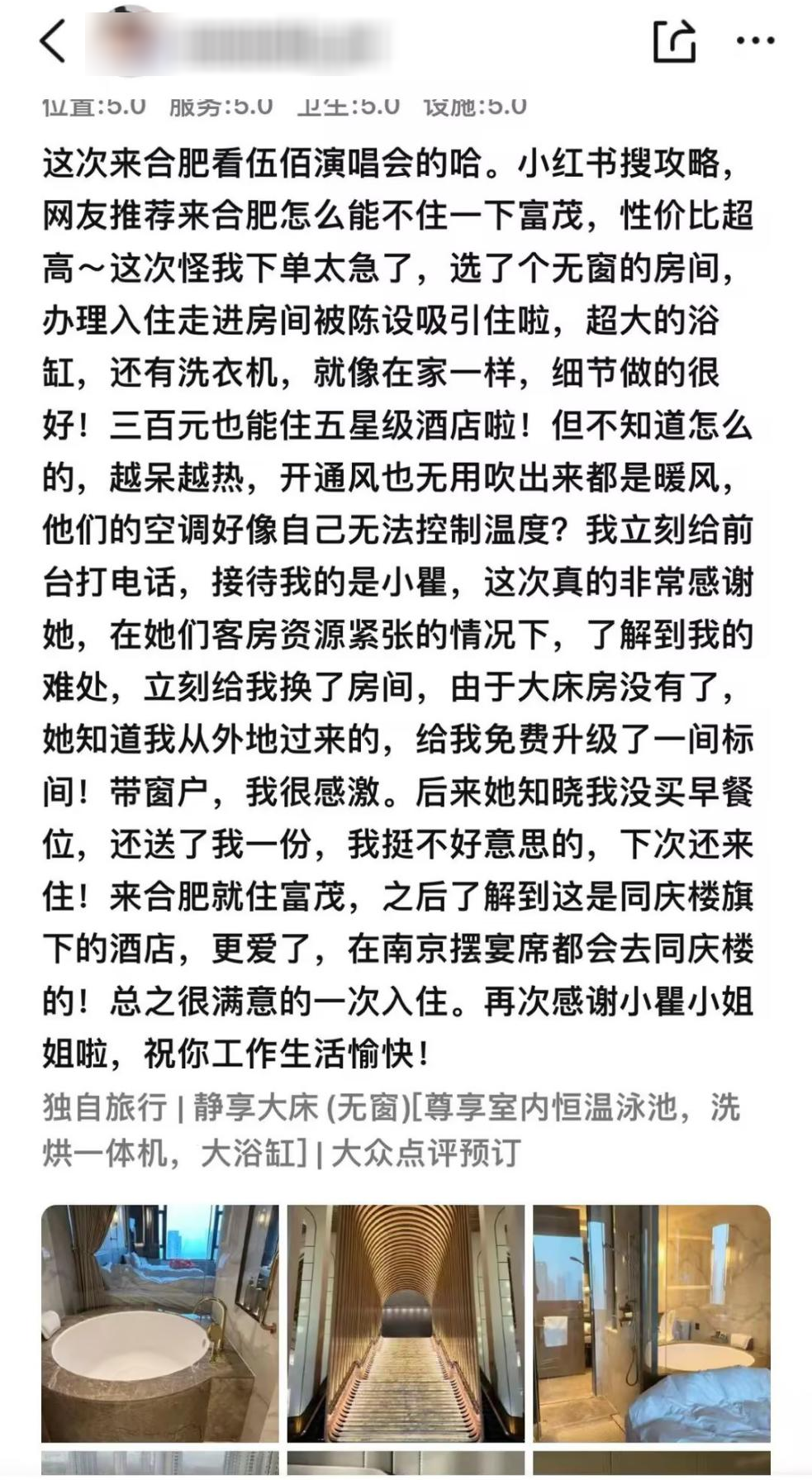 客人离店时在大众点评上写了一条200字点评,表示在南京家里有啥喜事都是去同庆楼,以后会一如既往支持,希望富茂尽快开到南京。