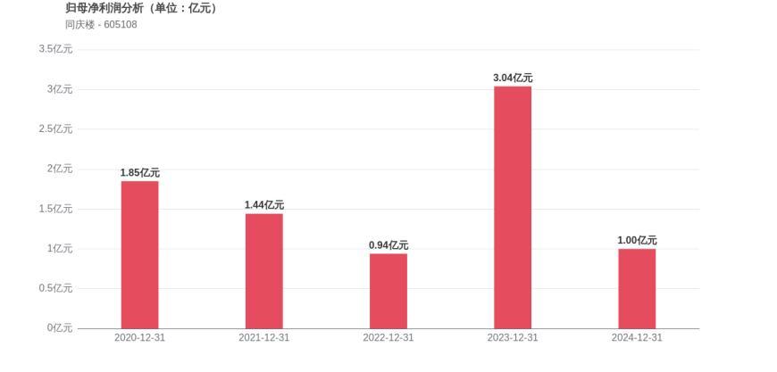 营收角度分析,同庆楼2020年实现营收12.96亿元,2024年达到25.25亿元。营收规模实现了近一倍的增长,显示出公司业务扩张的成效。