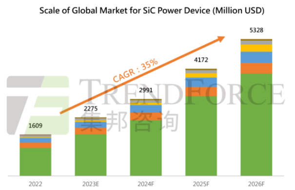 与此同时,受惠于下游应用市场的强劲需求,TrendForce集邦咨询预期,至2026年SiC功率元件市场规模可望达53.3亿美元,其主流应用仍倚重电动汽车及可再生能源。