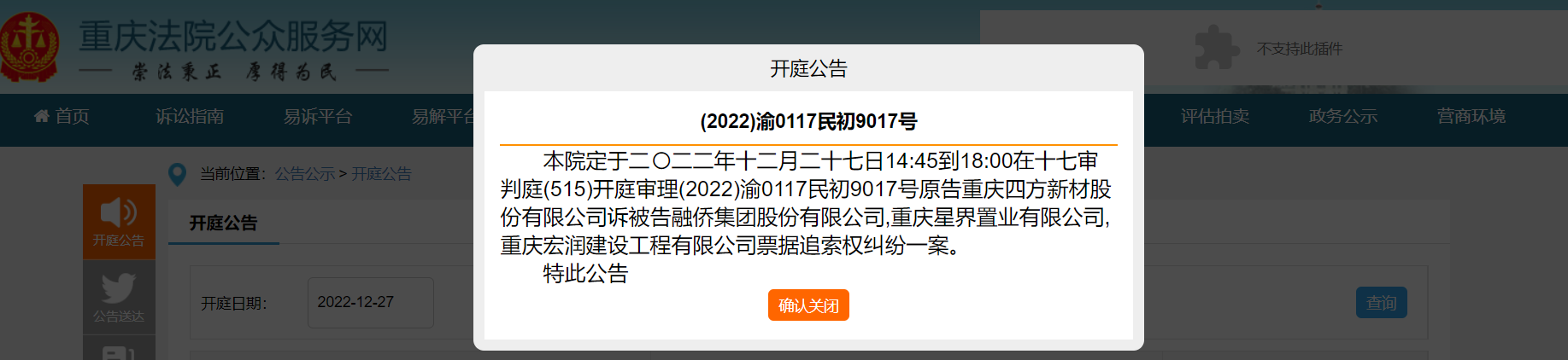 12月8日,融侨集团股份有限公司新增一则开庭公告。案件原告为重庆四方新材股份有限公司,被告为融侨集团股份有限公司、重庆宏润建设工程有限公司、重庆星界置业有限公司,案号为(2022)渝0117民初9017号,案由系票据追索权纠纷,案件将于2022年12月27日由重庆市合川区人民法院开庭审理。