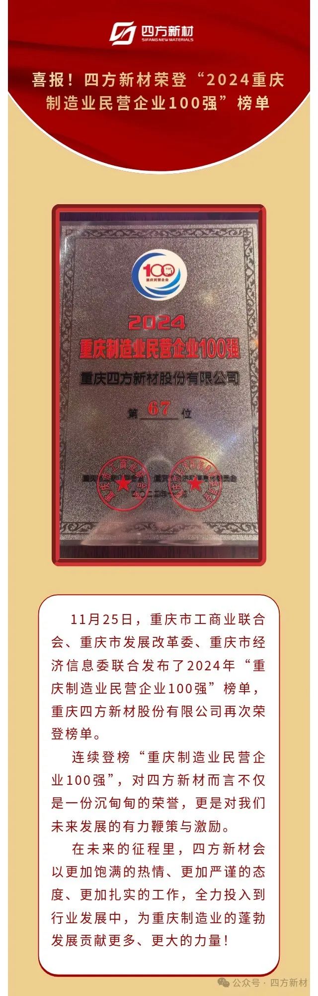 喜报!四方新材荣登“2024重庆制造业民营企业100强”榜单