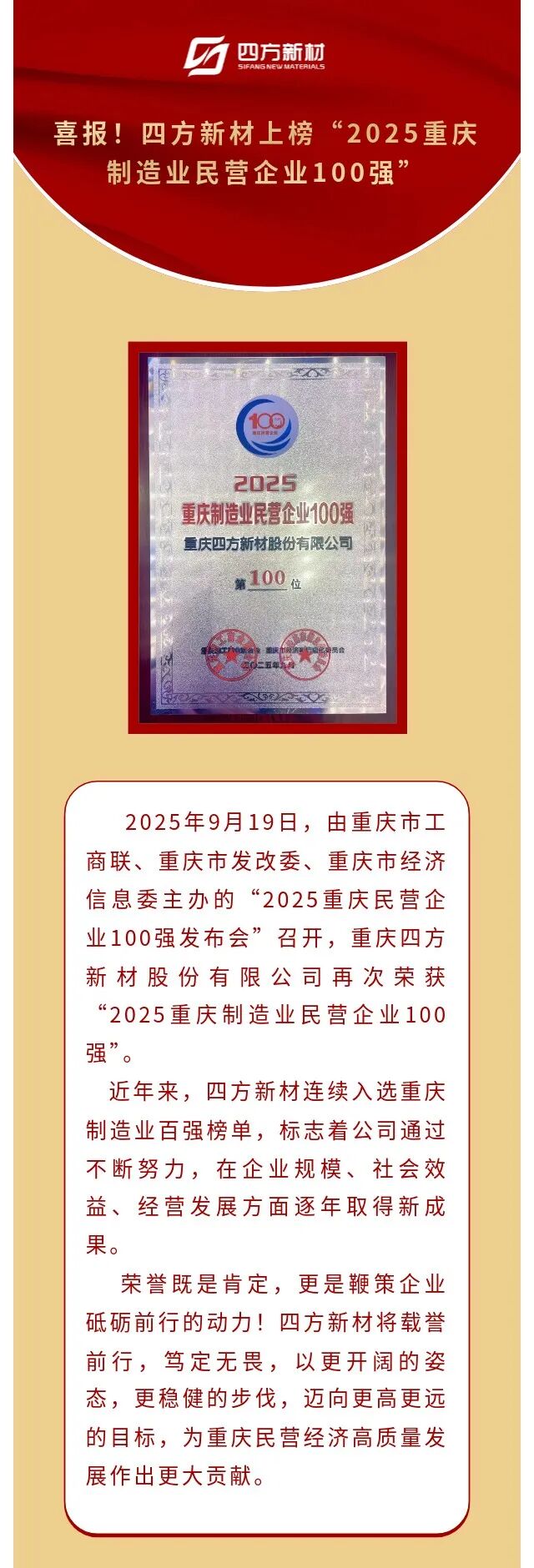 喜报!四方新材上榜“2025重庆制造业民营企业100强”
