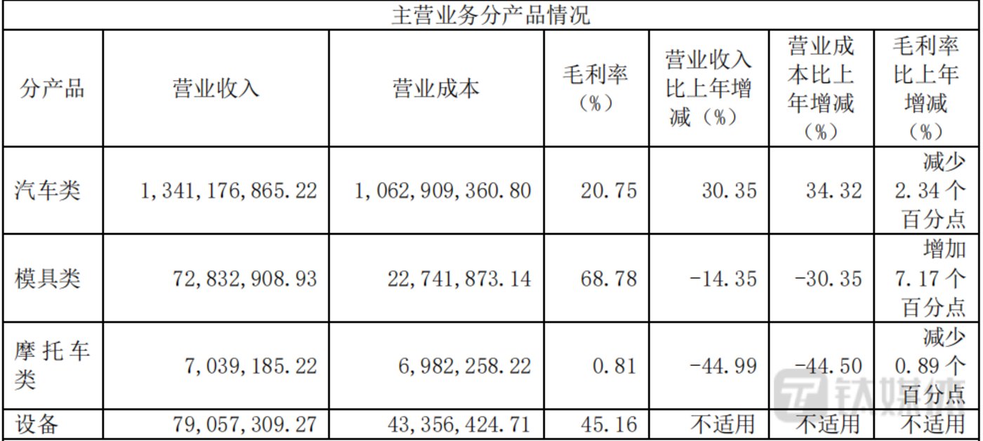 数据面上来看,除设备类业务2022年首次实现并表无可比性,其余产品中汽车类营收同比增长30.35%,模具类、摩托车类营收分别下滑14.35%、44.99%。