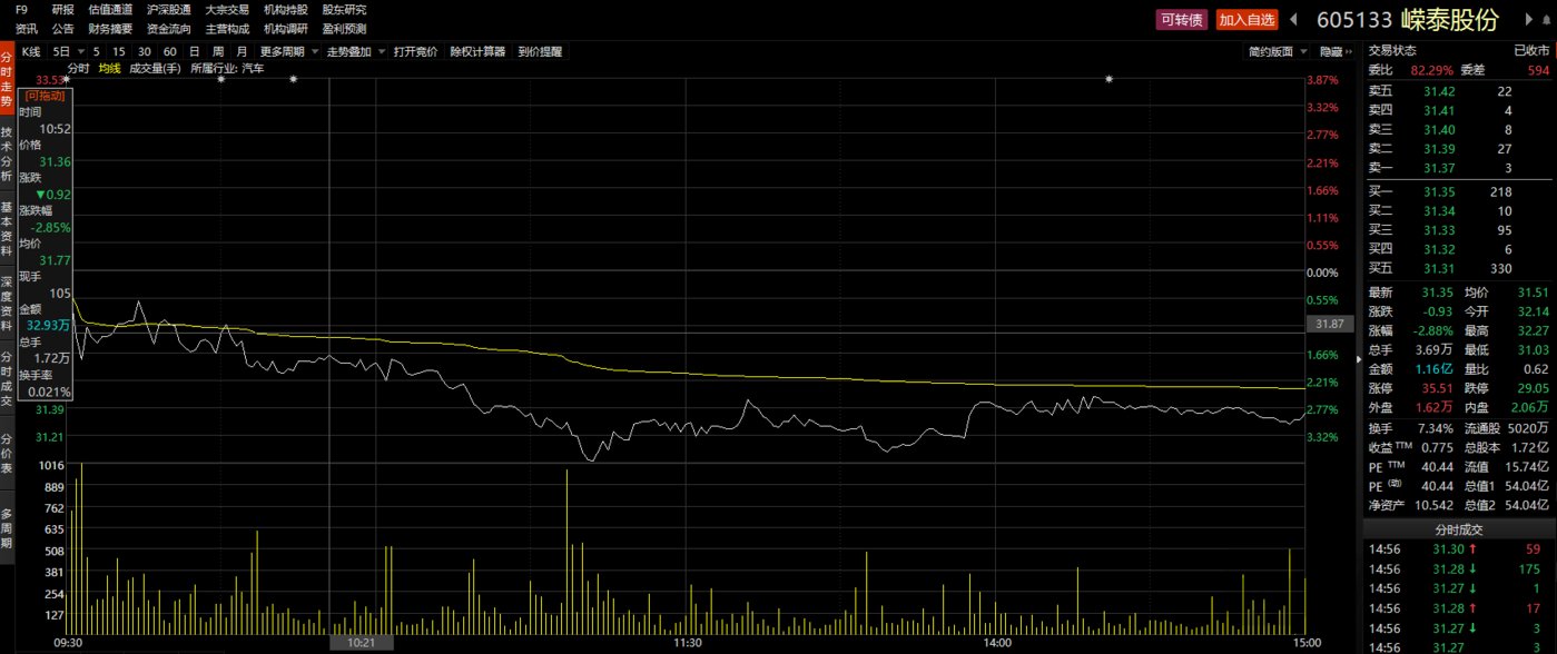虽然业绩报喜,但二级市场却并未给予嵘泰股份太多信心。4月6日,嵘泰股份股价开盘低开32.14元/股,之后一路震荡下行,盘中跌幅3.87%。截至收盘,报收31.35元/股,跌幅2.88%,总市值54.04亿元。