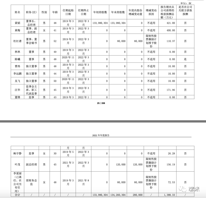 年报显示,2021年度,公司董事、监事和高级管理人员报酬总额为1,388.33万元。董事长、总经理黄韬2021年从公司领取薪酬为421.00万元,董事、副总经理黄梅2021年领取薪酬为400.00万元,董事、董事会秘书杜红谱2021年领取薪酬为110.37万元。