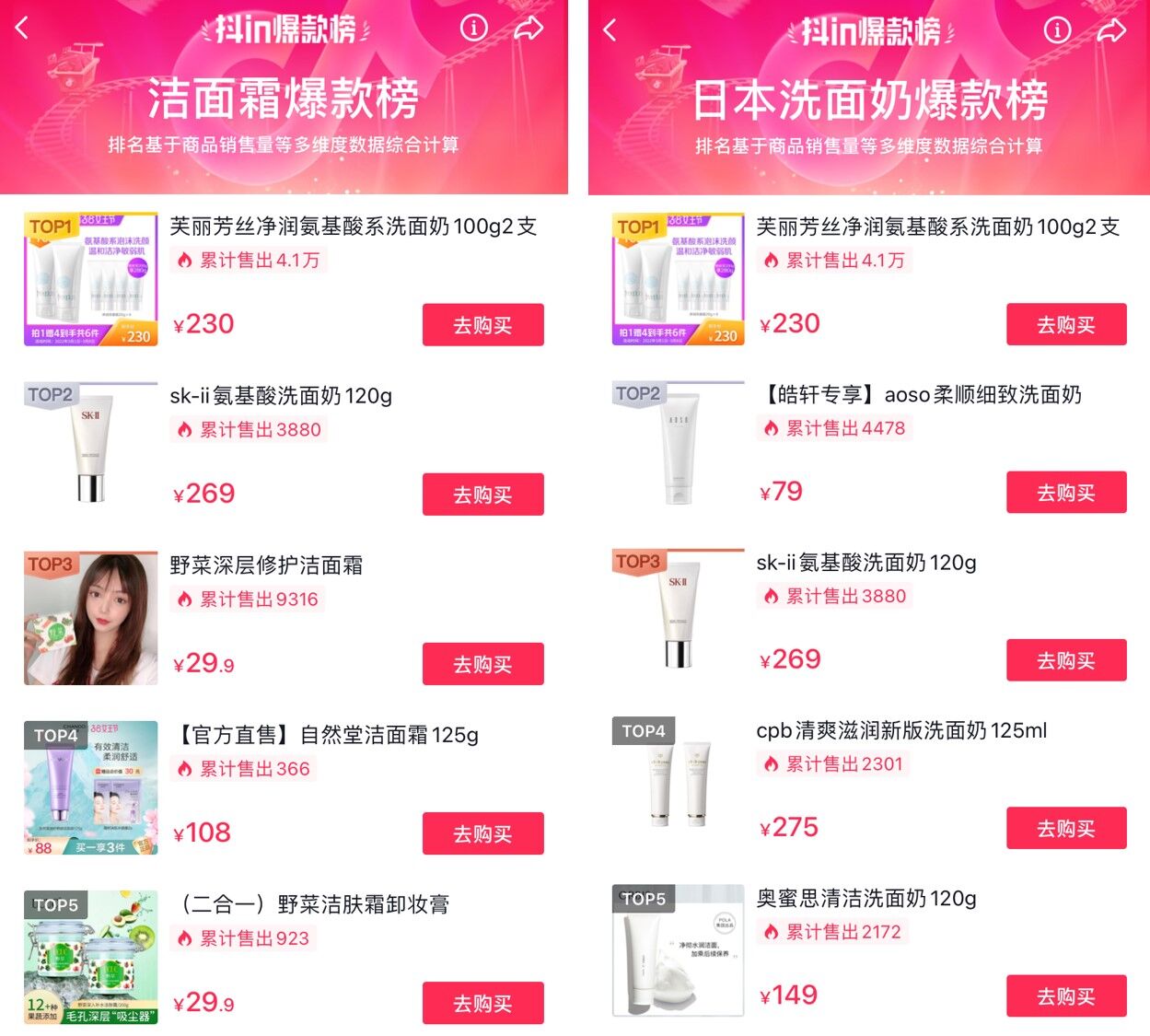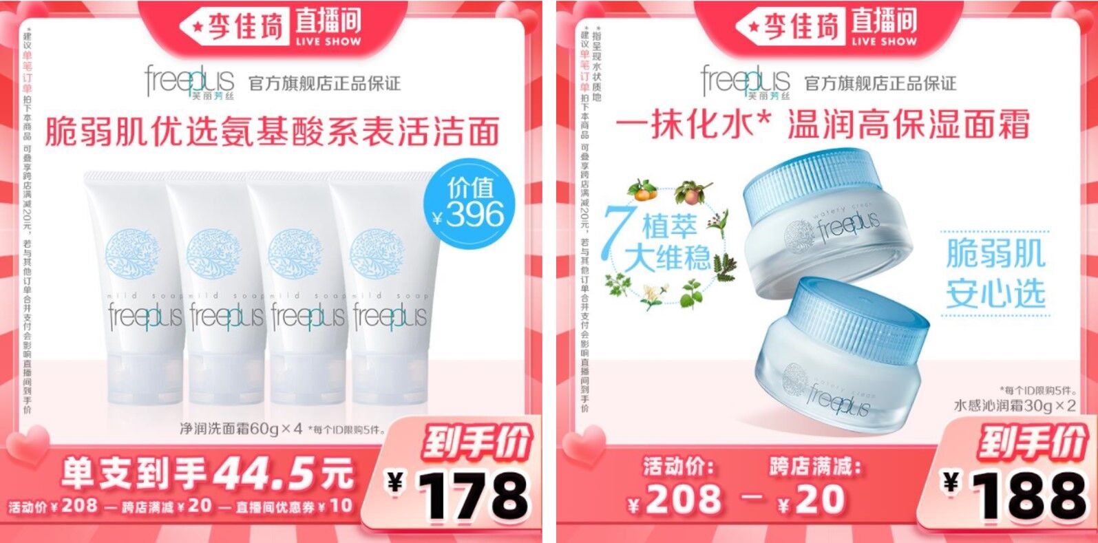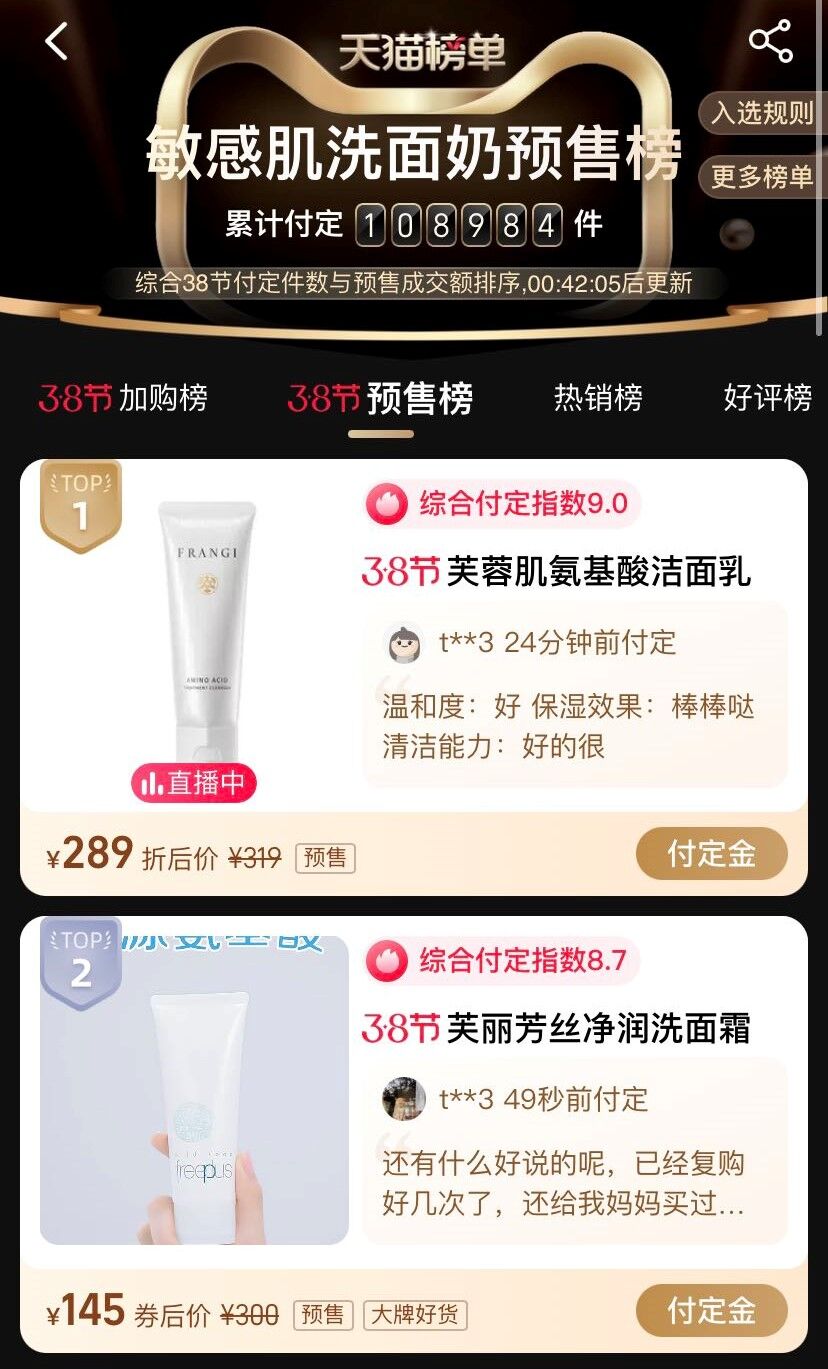 2022年3.8节期间,丽人丽妆助力日系品牌芙丽芳丝荣登抖音爆款榜、天猫预售榜等双平台多个榜单。芙丽芳丝明星单品氨基酸洗面奶在抖音洁面霜爆款榜、日本洗面奶爆款榜均排名第一;预售阶段,芙丽芳丝保湿面霜与氨基酸洁面同时入选李佳琦直播间,爆款洁面荣登天猫敏感肌洗面奶预售榜top2,跨平台持续热销。