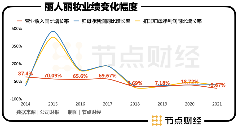 连续八年两位数的归母净利润增长率固然亮眼,但丽人丽妆的业绩也并非没有“漏洞”。从丽人丽妆的业绩变化幅度可以清晰看到: