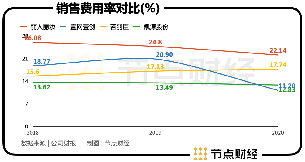 拿销售费用来说,丽人丽妆的销售费用率确实呈现出逐年降低的趋势,但有一说一,同行比较而言,丽人丽妆的销售费用率相对是最高的,还大有进步空间。