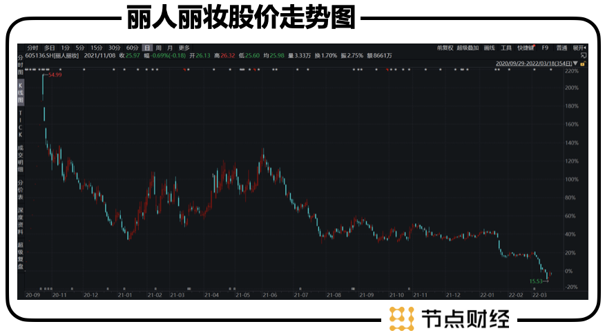 “出道即巅峰”,54.99成了丽人丽妆绕不过的高山。上市当天43.99%的涨幅+11个涨停封死,“妖股”的后续之路并不好走。除了这高光的12天,丽人丽妆后续的股价走势便是在回撤与低迷中反复横跳,最大回撤了72%。