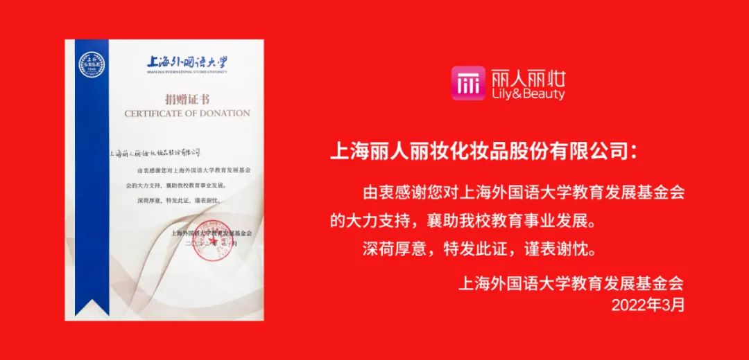 上海当前正处于疫情防控的关键阶段,自3月防疫升级以来,丽人丽妆组织开展了一系列公益活动,积极履行企业社会责任。2022年3月31日,丽人丽妆追加捐赠共计35,000枚口罩、200套防护服,专车专送徐家汇街道、漕河泾街道等社区疫情防控一线,并向上海外国语大学教育发展基金会捐赠了一批洗护产品,为封闭在校的上外师生们送上温暖。在3月18日,丽人丽妆已经向上海交通大学捐赠了价值16万元、2400多件沐浴露、洗面奶、洗发水、牙膏等生活物资。
