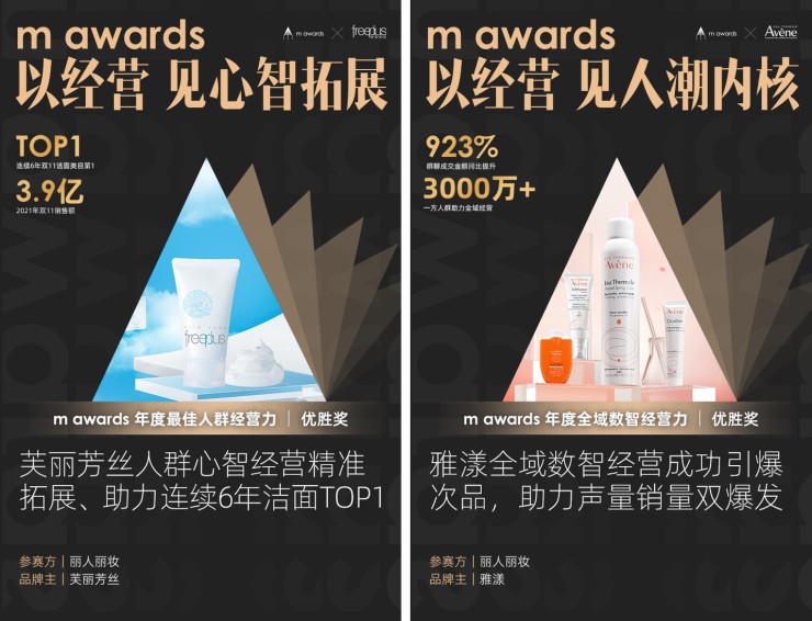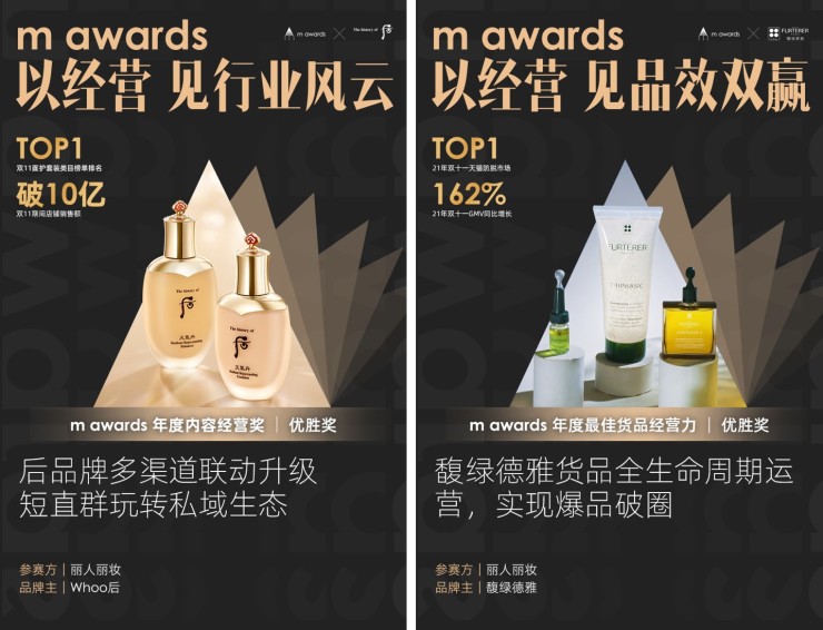4月19日,阿里妈妈m awards 颁奖典礼成功举办,发布会以“经营见时代”为主题,揭晓了2022 m awards 各项年度经营大奖,丽人丽妆一举斩获四项大奖,助力Whoo后、馥绿德雅、芙丽芳丝、雅漾分别摘得年度内容经营奖、最佳货品经营力奖、最佳人群经营力奖、全域数智经营力奖。恭喜获奖合作品牌、感谢运营伙伴的努力,共同助力品牌经营收获更多确定性增长。