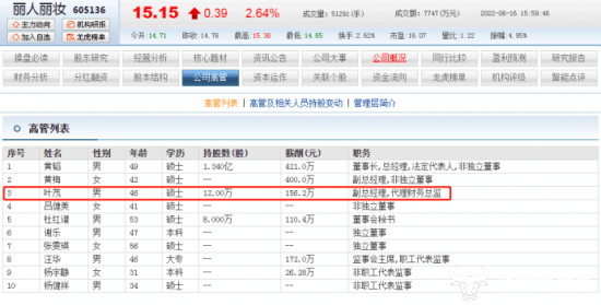据东方财富网显示,叶茂在丽人丽妆的薪酬为156.2万元,而与他同为副总经理的黄梅为400万元,叶茂比她低了二百四十多万,这可能是与他任职不久有关。