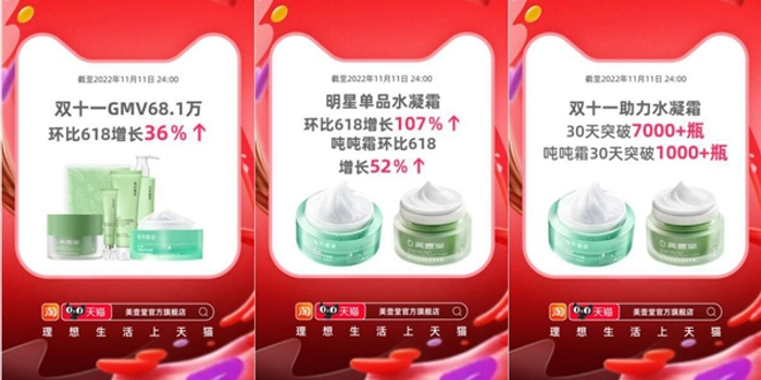截止11月11日24时,2022年天猫双11购物节已落下帷幕,丽人丽妆孵化品牌美壹堂活动期间成交金额环比今年618增长36%。明星单品美壹堂水凝霜热销7000+瓶,销售额环比618增长107%;美壹堂吨吨霜销售额环比618增长52%。美壹堂贴片面膜登上天猫双11舒缓贴片面膜热销榜、好评榜、加购榜等三大榜单。美壹堂天猫旗舰店荣登淘宝群·美妆护肤彩妆类目成交占比TOP榜单。