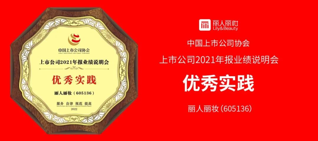 2022年12月30日,中国上市公司协会发布了“上市公司年报业绩说明会优秀实践”榜单,丽人丽妆名列其中。该榜单是对国内上市公司年报业绩说明会召开情况的综合评价,以筹备、高管参与、问题回复及质量、特色创新做法等多维度分析业绩说明会召开的实际情况及效果,综合评估出有代表性、有特色、高水准的实践案例,旨在引导上市公司高质量召开业绩说明会,形成示范效应,使业绩说明会真正成为公司传递价值、投资者发现价值的桥梁。