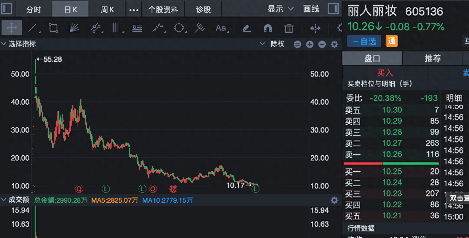 也是从12个涨停板之后,丽人丽妆便开启了至今已三年多的“收割”之路。截止10月16日收盘,每股收报10.26元。也就是说,公司在上市1100天之后,总市值与前期高点相比、已经暴跌近80%,同时也早已跌破了发行价。