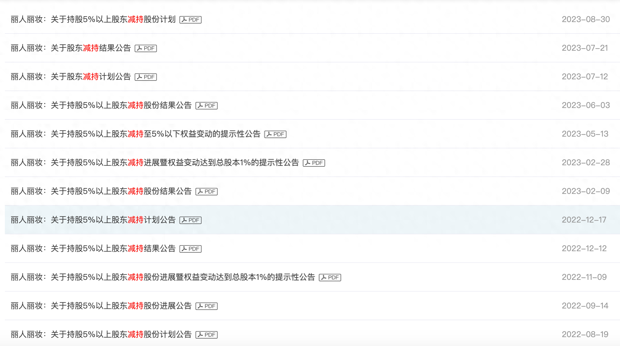 面对一些列的困境,丽人丽妆给市场带来的却是股东减持。2023年6月初,丽人丽妆发布公告,公司股东Crescent Lily Singapore Pte.Ltd以集中竞价交易、大宗交易方式减持公司股份800.91万股,占公司普通股总股本比例为2%,本次减持价格区间为12.64-17.51元/股,套现1.12亿元