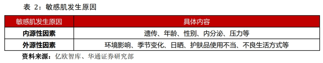 然而,敏感肌发生的原因是多方面的。根据华通证券研报,敏感肌发生的原因可分为内源性和外源性两大类,以内源性因素为例,可细分为遗传、年龄、性别、内分泌、压力等因素。