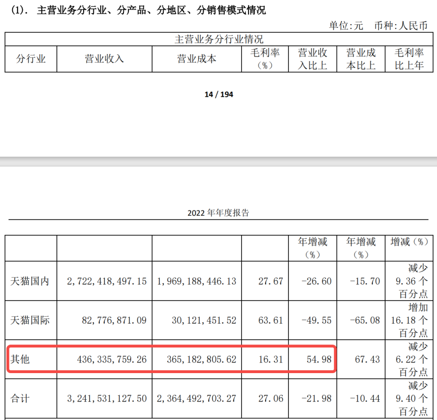 2023年,公司非天猫平台收入为5.0亿元,同比增长14.63%,而2022年的同比增速是54.98%,说明非天猫平台的增速也在明显下滑。