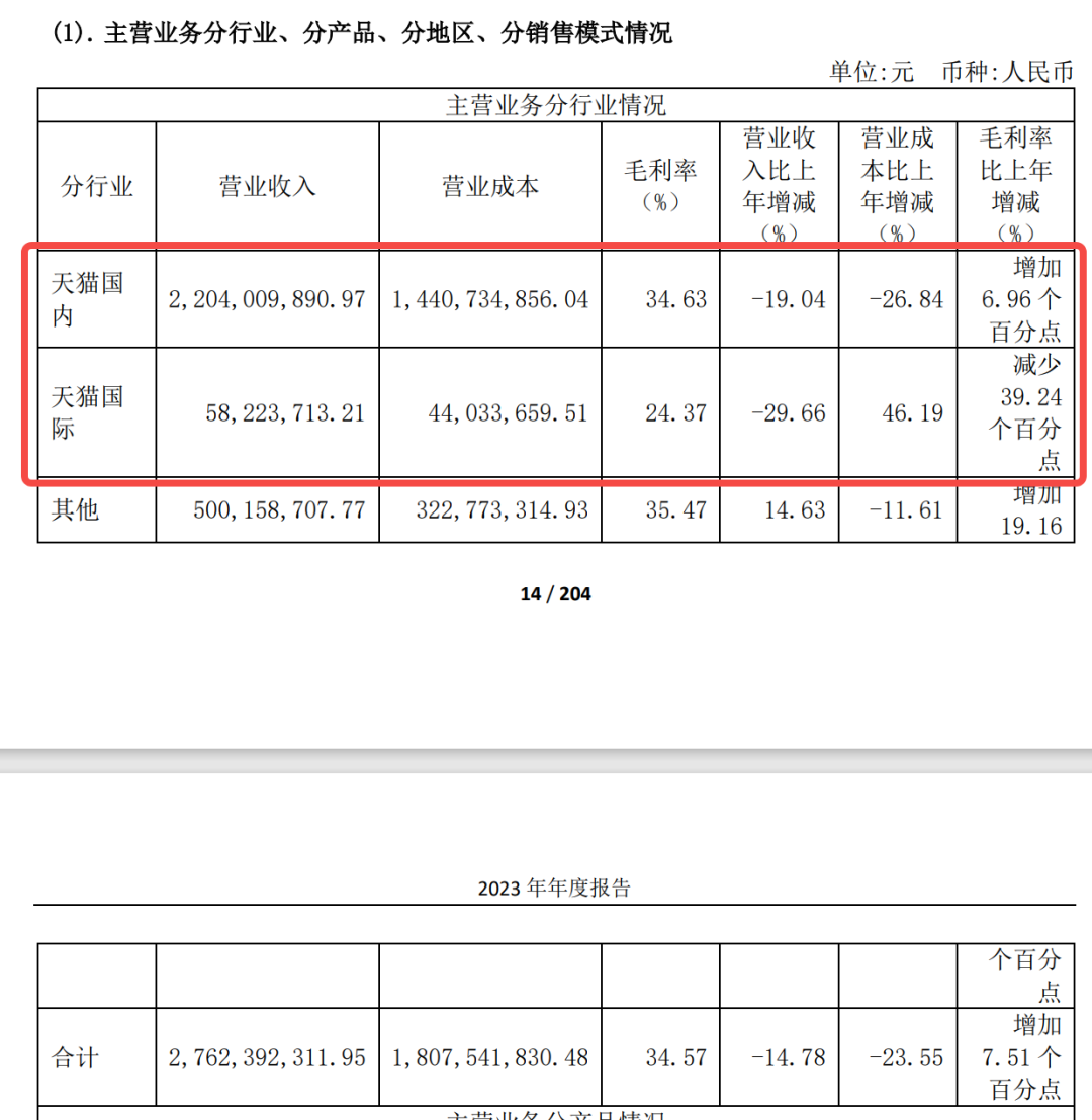 同时,来自天猫平台的营收也在下降。其中,天猫国内平台2023年实现营收22.04亿元,同比下滑19.04%;天猫国际平台实现营收5822.37万元,同比下滑29.66%。