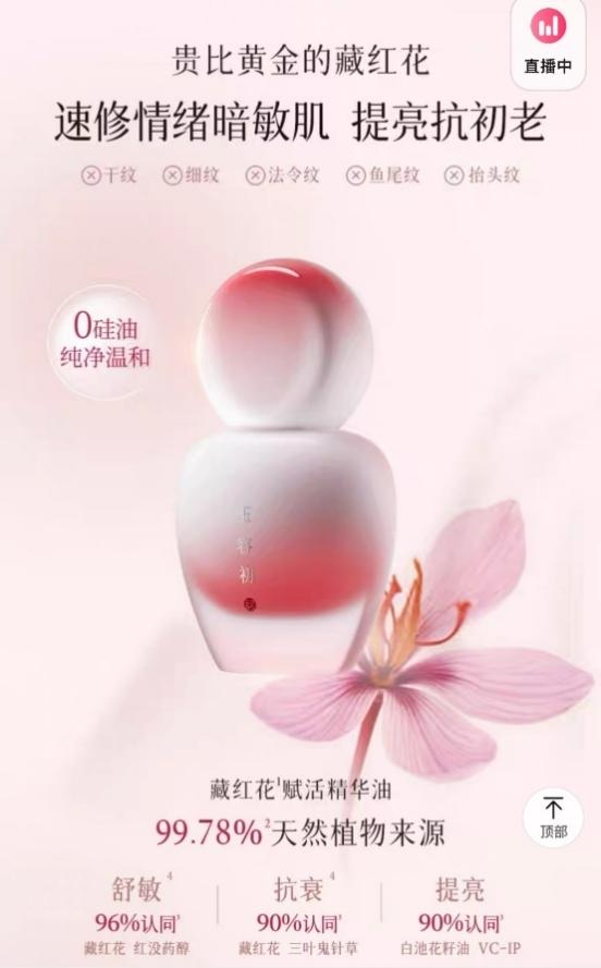 以玉容初核心单品藏红花精华油为例,据其天猫旗舰店介绍,产品主要通过藏红花、三页鬼针草、白池花籽油等成分,达到舒敏、抗衰、提亮的效果。
