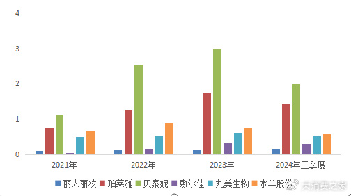 近几年,由于营业收入持续减少,丽人丽妆为降本增效逐步降低销售费用。同时,对比其他品牌化妆品企业,丽人丽妆销售费用亦处于较低水平。2024年前三季度,丽人丽妆、珀莱雅、贝泰妮、敷尔佳、丸美生物、水羊股份的销售费用分别是3.91、32.32、20.10、4.92、10.71、15.06亿元。上述公司的销售费用是丽人丽妆的8.26、5.14、1.26、2.74、3.85倍。