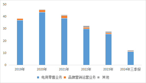 随着兴趣电商、社区团购等新渠道兴起,以天猫为主要阵地的丽人丽妆主营业务持续下滑,自2020年上市以来,丽人丽妆的电商零售业务即一改上市前增长态势,一路下滑。电商零售业务收入从2020年的43.62亿元下降至2023年的25.64亿元,品牌营销运营业务从2020年的1.99亿元下降至2023年的0.89亿元。