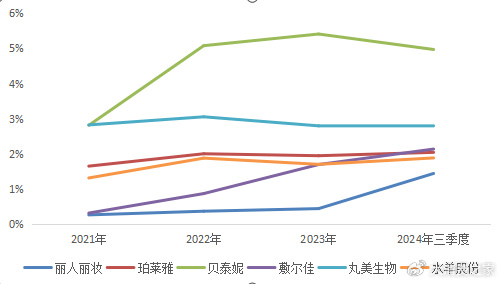 从研发费用率看,丽人丽妆的研发费用率亦多年低于其他品牌化妆品公司。2024年前三季度,丽人丽妆、珀莱雅、贝泰妮、敷尔佳、丸美生物、水羊股份的研发费用率分别是1.44%、2.04%、4.97%、2.14%、2.79%、1.89%。