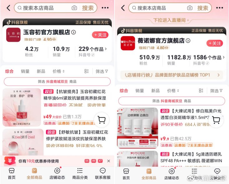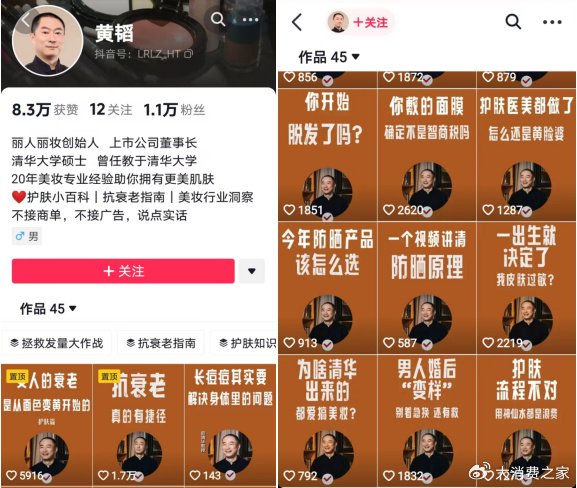 为宣传玉容初品牌理念,毕业于清华大学自动化专业,如今被聘任为中关村炎黄中医药科技创新联盟国医经方传承专业委员会副会长的黄韬也在抖音平台发布了多条视频,讲解情绪、护肤、抗衰老等多种内容。但截至2024年12月20日,其粉丝量较低仅1.1万,似乎并未得到市场较多的青睐。公司并未披露玉容初等自有品牌实际销售情况,仅在半年报中提及,2024年上半年,公司自有品牌整体销售收入实现增长,相比去年同期增长超160%。