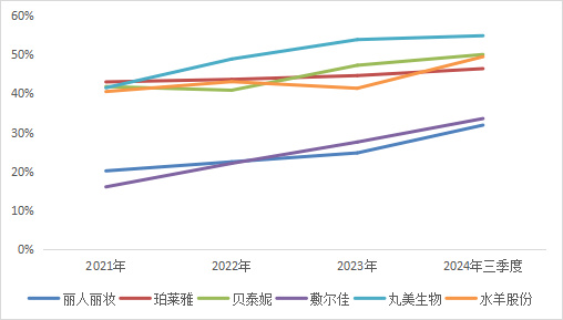 同时,公司销售费用率亦处于较低水平,2024年前三季度,丽人丽妆、珀莱雅、贝泰妮、敷尔佳、丸美生物、水羊股份的销售费用率分别是31.88%、46.39%、50.03%、33.56%、54.85%、49.46%。对比其他品牌化妆品企业的“重营销、轻研发”,丽人丽妆研发费用率及销售费用率均低于同行,呈现出“轻研发、轻营销”状态。