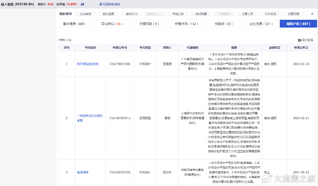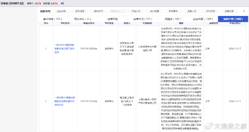 同时,在各化妆品企业重视以专利表明研发实力的情况下,丽人丽妆名下专利有13项,其中有效专利仅2项,专利名称分别是“梳子(鲸益经络梳)”、“一种超声波奶粉搅拌装置”,并无相关化妆品专利。对比贝泰妮名下专利有403项,其中包括“一种淡竹叶提取物的制备方法及其产品和应用”、“一种利用3D黑素皮肤模型筛选原料美白功效的方法”等。