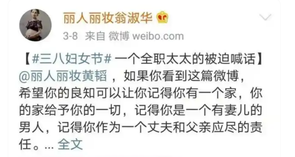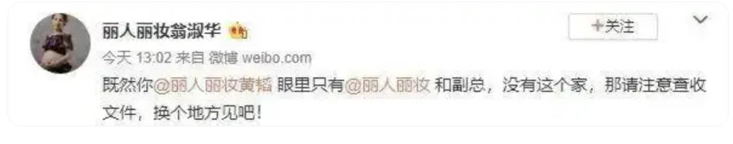 3月11日,翁淑华再度微博发声:“既然你丽人丽妆黄韬眼里只有丽人丽妆和副总,没有这个家,那请注意查收文件,换个地方见吧!