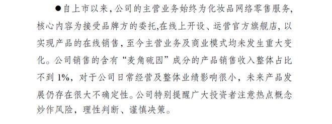 值得一提的是,丽人丽妆公告特别指出,公司销售的含有“麦角硫因”成分的产品销售收入整体占比不到1%,对于公司日常经营及整体业绩影响很小,未来产品发展仍存在很大不确定性。