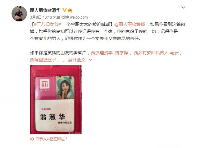 2021年3月11日,翁淑华再度在微博发声:“既然你丽人丽妆黄韬眼里只有丽人丽妆和副总,没有这个家,那请注意查收文件,换个地方见吧!”