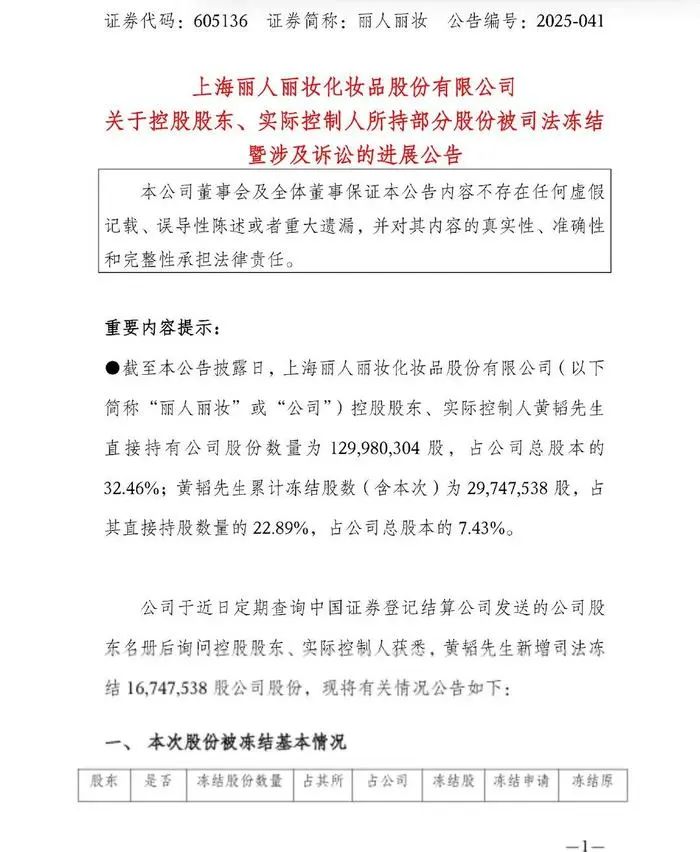 截至本公告披露日,丽人丽妆控股股东、实际控制人黄韬先生直接持有公司股份数量为1.29980304亿股,占公司总股本的32.46%;黄韬先生累计冻结股数为2974.7538万股,占其直接持股数量的22.89%,占公司总股本的 7.43%。