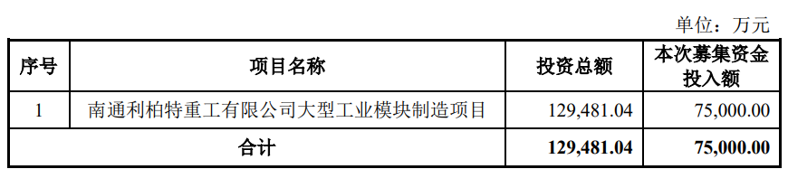 利柏特2024年12月19日披露的向不特定对象发行可转换公司债券募集说明书(申报稿)(修订稿)显示,公司本次发行的可转债所募集资金总额为75,000.00万元(含本数),扣除发行费用后,用于南通利柏特重工有限公司大型工业模块制造项目。