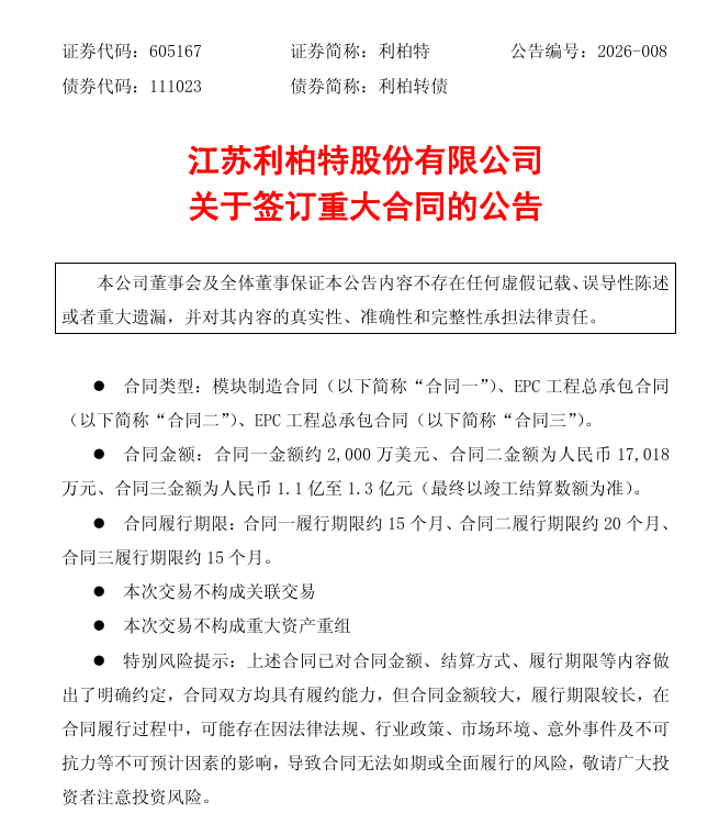 3月23日晚间,江苏利柏特股份有限公司(605167.SH,以下简称“利柏特”)发布公告,宣布近日连续签署三份重大合同,总金额折合人民币逾4.6亿元,彰显其在高端工业工程领域的持续拓展能力。