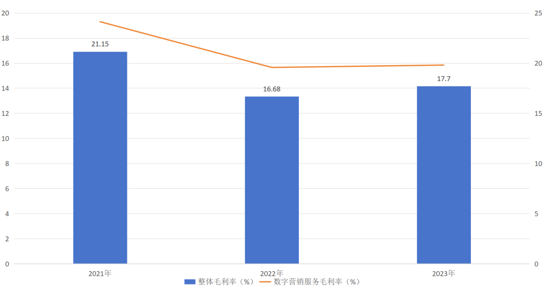 原因系主营业务表现遇缓,2023年其数字营销服务(占比89.5%)营收为47.34亿,同比下滑8.37%。