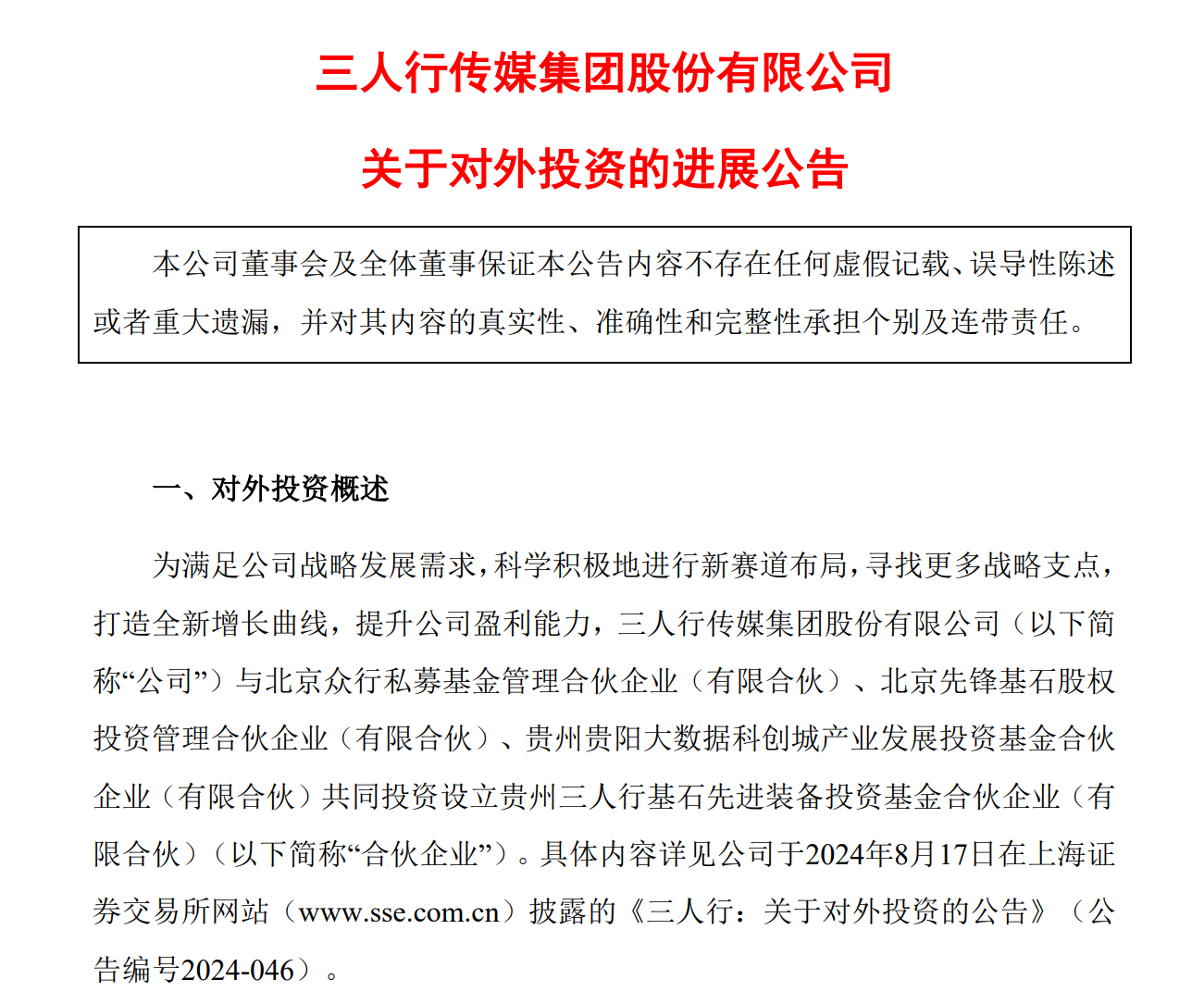 三人行公告披露,其的主要投资方向为高技术领域中的具有商业价值的科技公司。
