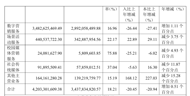 营收净利连续两年“双杀”背后,是主营核心业务的“塌陷”,年报显示,贡献超八成收入的“现金牛”数字营销服务营收34.82亿元,同比跌26%。