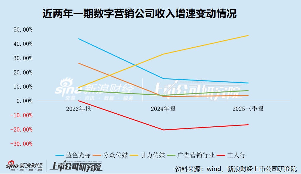 Wind数据显示,2023年至2025年前三季度,广告营销行业(申万分类)营业收入总额分别同比增长7.17%、3.87%、7.19%。其中,蓝色光标营业收入分别同比增长43.44%、15.55%、12.49%,分众传媒营业收入分别同比增长26.30%、3.01%、3.73%,引力传媒营业收入分别同比增长9.34%、32.73%、45.78%。