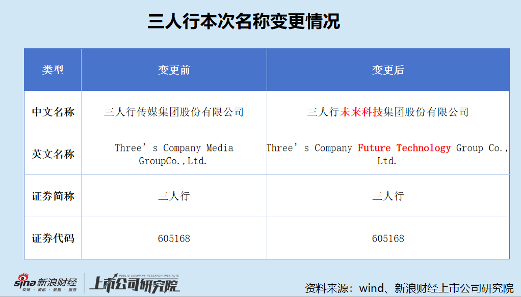 2026年3月7日,三人行传媒集团股份有限公司(简称“三人行”或“公司”)发布公告称,拟将中文名称变更为“三人行未来科技集团股份有限公司”,英文名称“Three’s Company Media GroupCo.,Ltd.”变更为“Three’s Company Future Technology Group Co., Ltd.”,行业分类“商务服务业”(L72)变更为“互联网数据服务”(I6450)。