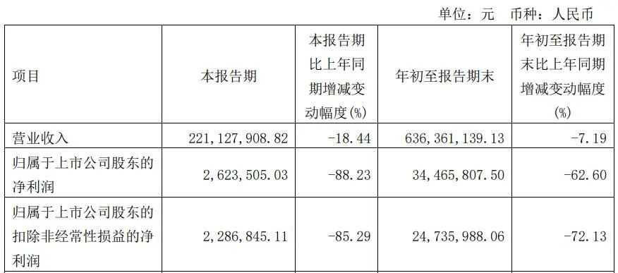 其中,第三季度实现营收2.21亿元,同比减少18.44%;实现净利润262.35万元,同比减少88.23%;实现扣非净利润228.68万元,同比减少85.29%。