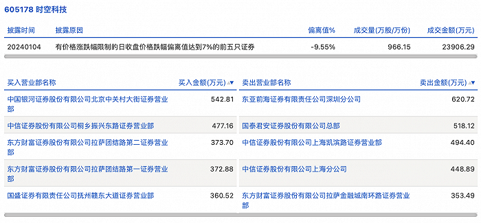 1月4日,时空科技今日跌停,全天换手率达15.56%,振幅达1.79%。龙虎榜数据显示,营业部席位合计净卖出308.55万元。其中,东亚前海证券深圳分公司、国泰君安证券总部分别卖出620.72万元、518.12万元;中国银河证券北京中关村大街证券营业部、中信证券桐乡振兴东路证券营业部分别买入542.81万元、477.16万元。